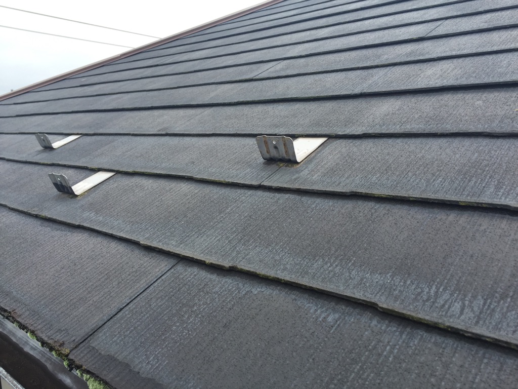 コロニアル屋根はタスペーサー挿入。 プライマー塗布後ヤネフレッシュ塗装。
