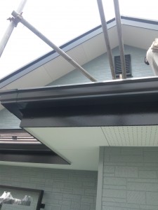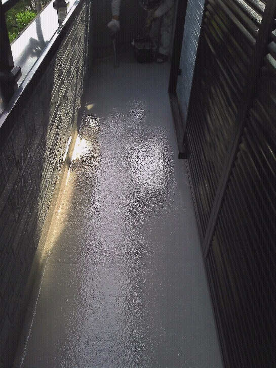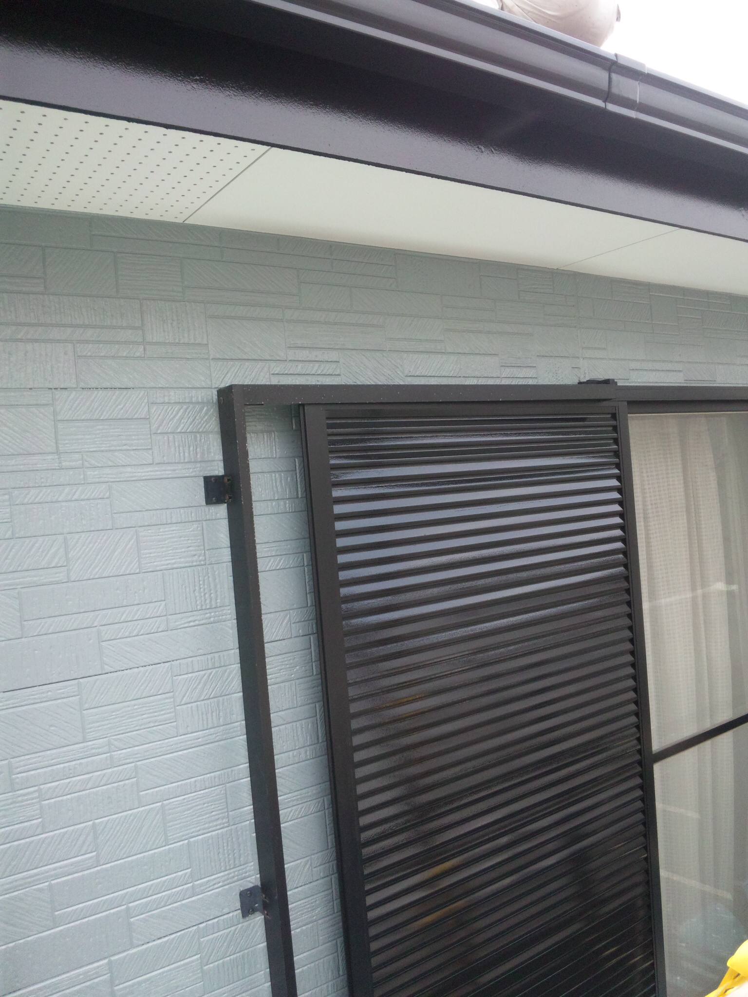 破風板や雨戸、雨樋部分の塗装。ベランダの防水床塗装。
