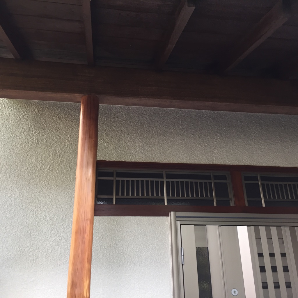 母屋の玄関回りの塗装。キシラデコール(防腐剤入り塗料)。