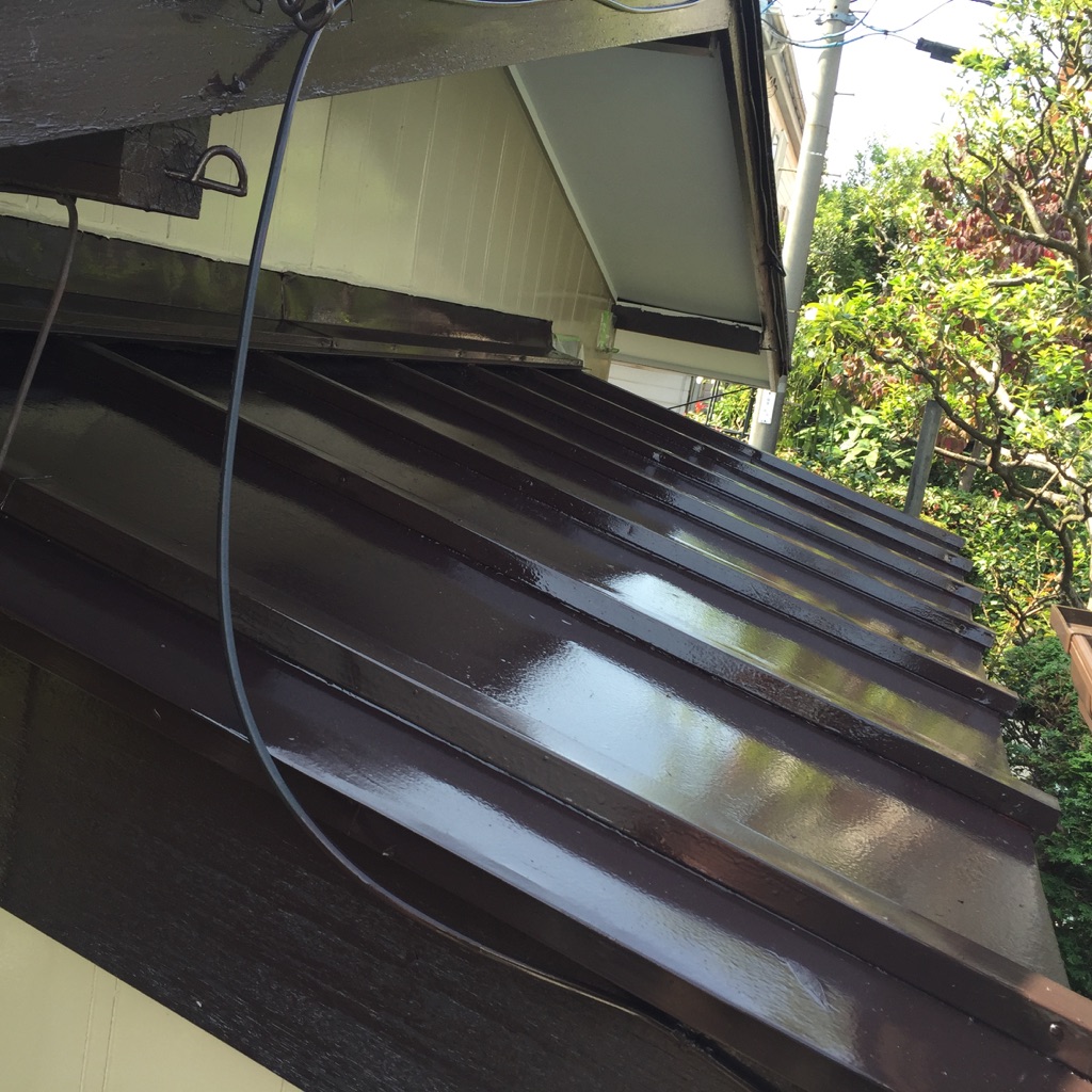 破風板、トタン屋根塗装。マイルドシリコン ココナツブラウン色。