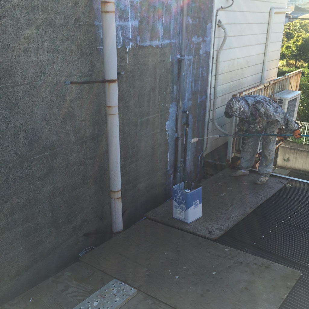 西面外壁 シーラー塗装(外壁の状態が悪いためにフィーラー塗装の前工事)。及び下塗りフィーラー塗装。