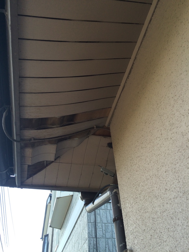下の写真のように軒裏の化粧板が激しく劣化しておりますが、恐らく漏水によるものがと思われます。