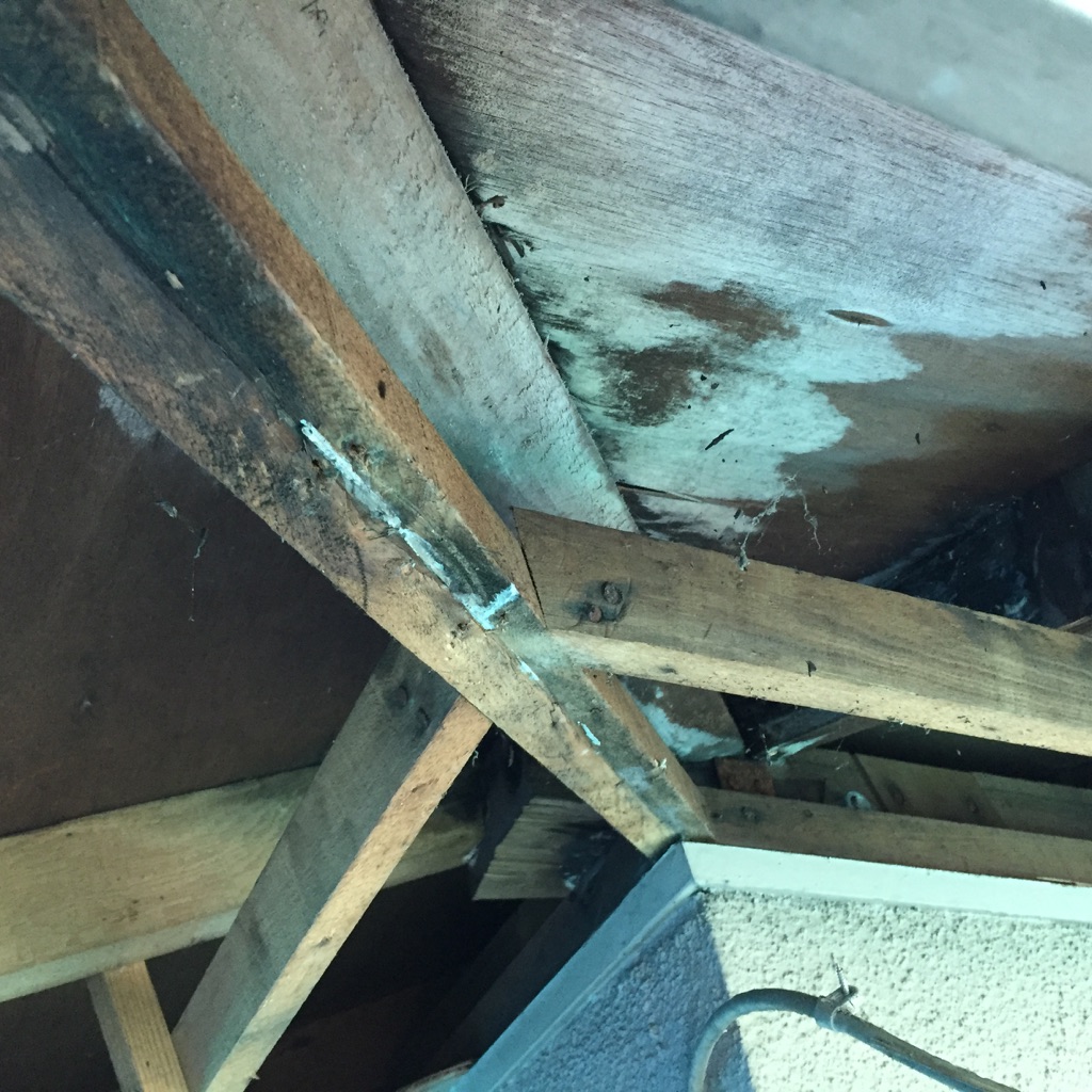 *下の写真は軒天解体後のものです。白くなっている部分は水が浸みて、かびているものです。