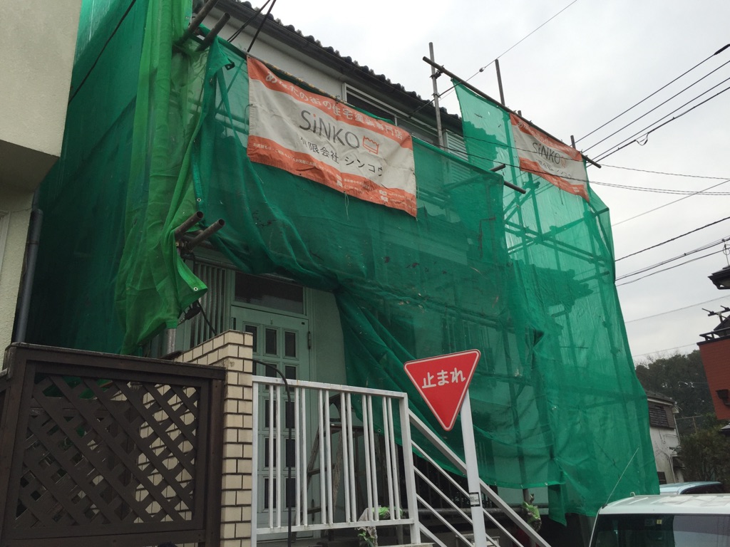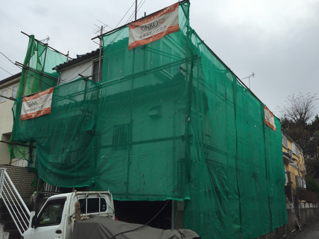 メッシュシート張り付け作業。