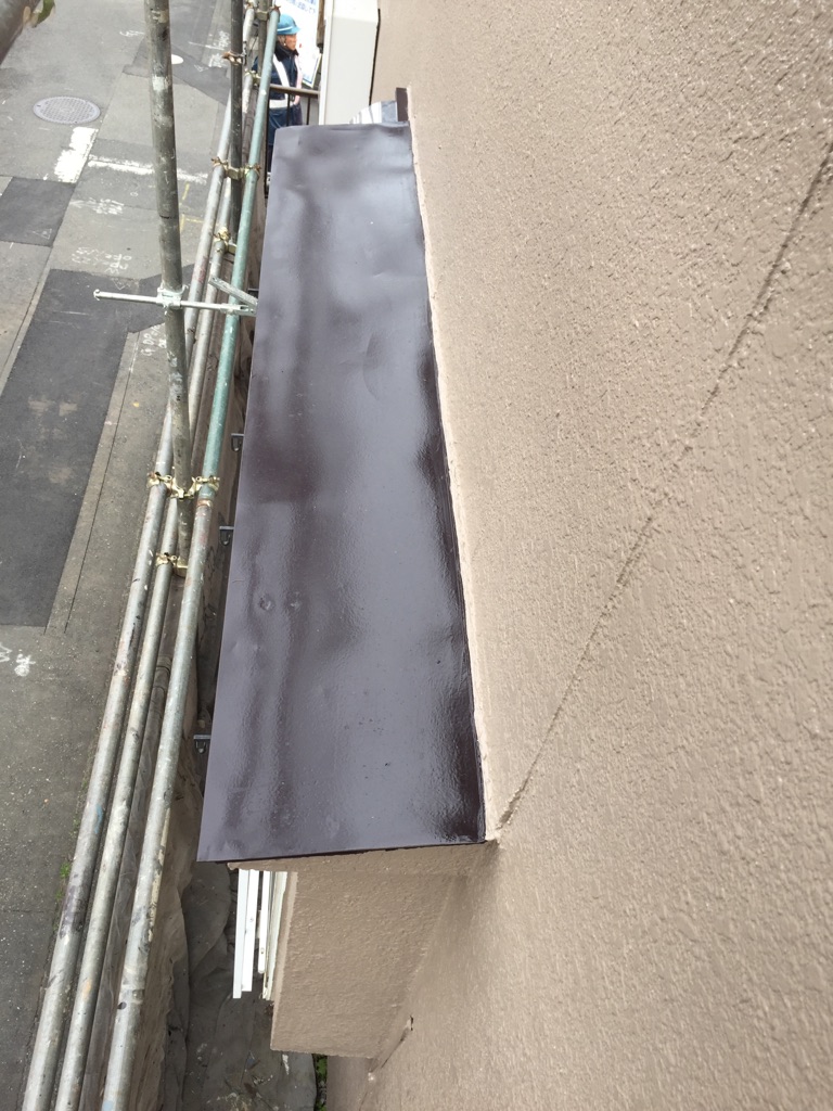 養生を外しながら、鉄骨及びトタンの塗装。ココナツブラウンにて。