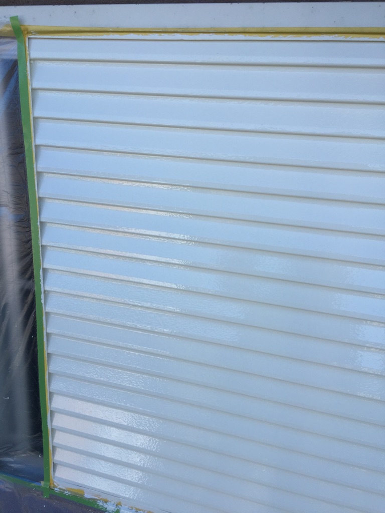 鋼製雨戸及び戸袋の上塗り。マイルドシリコン 色アイボリーにて塗装。