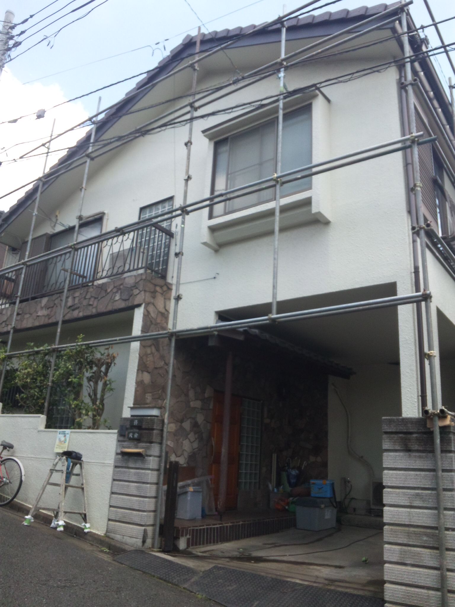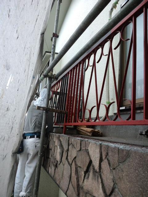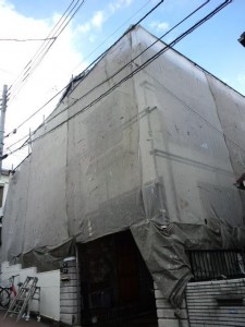作業の方ですが、やはりまず足場を組みました。次に鉄部のさび止メッシュシート掛け、最後に高圧洗浄をさせていただきました。