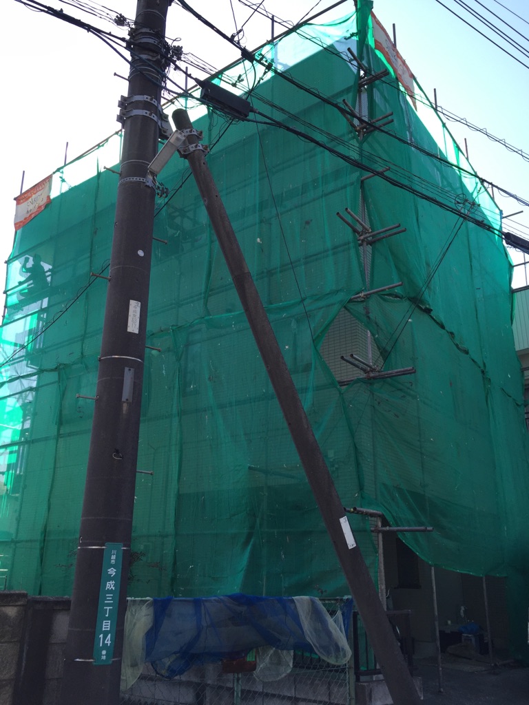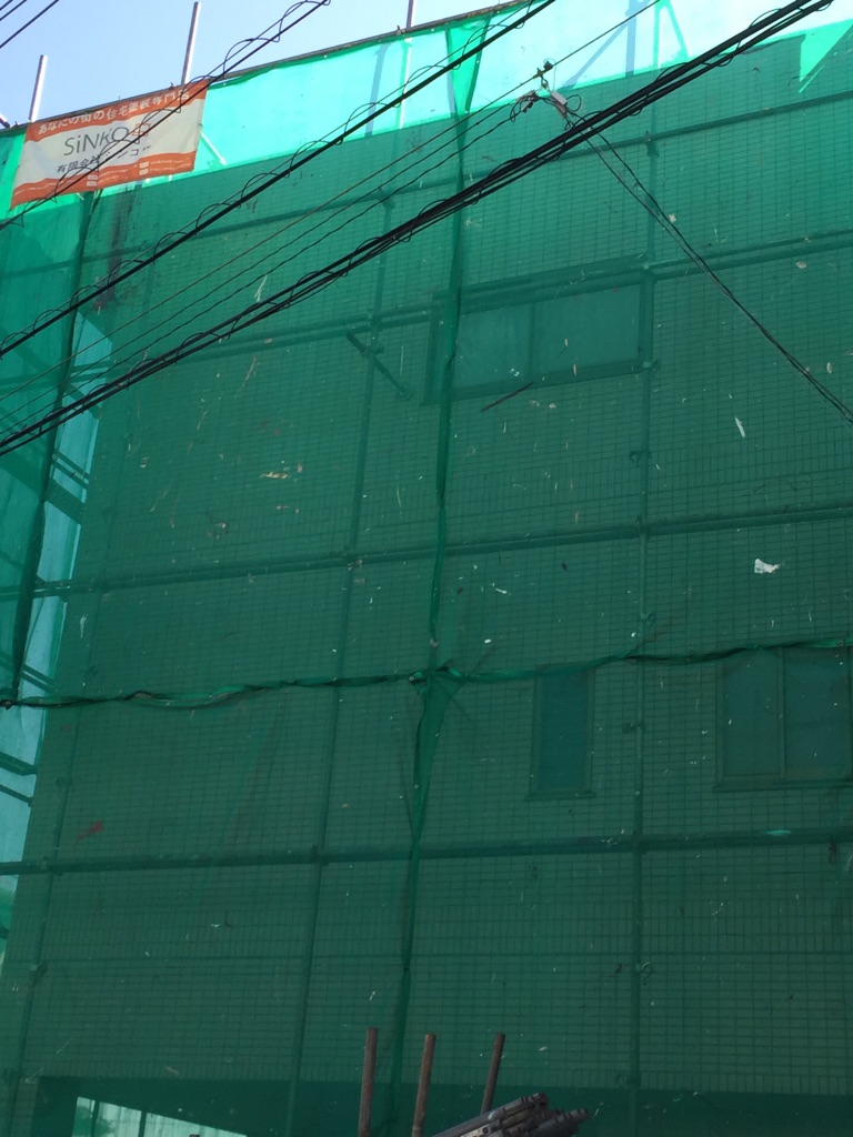 足場の組み立てです。3階建て、しかもタイル貼のため壁の控え具を使えないために、危険なので注意が必要です。