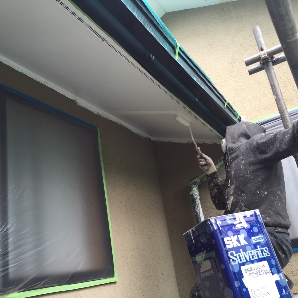 軒天の劣化部分のパテ処理。及び塗装を水性ケンエースにて作業。