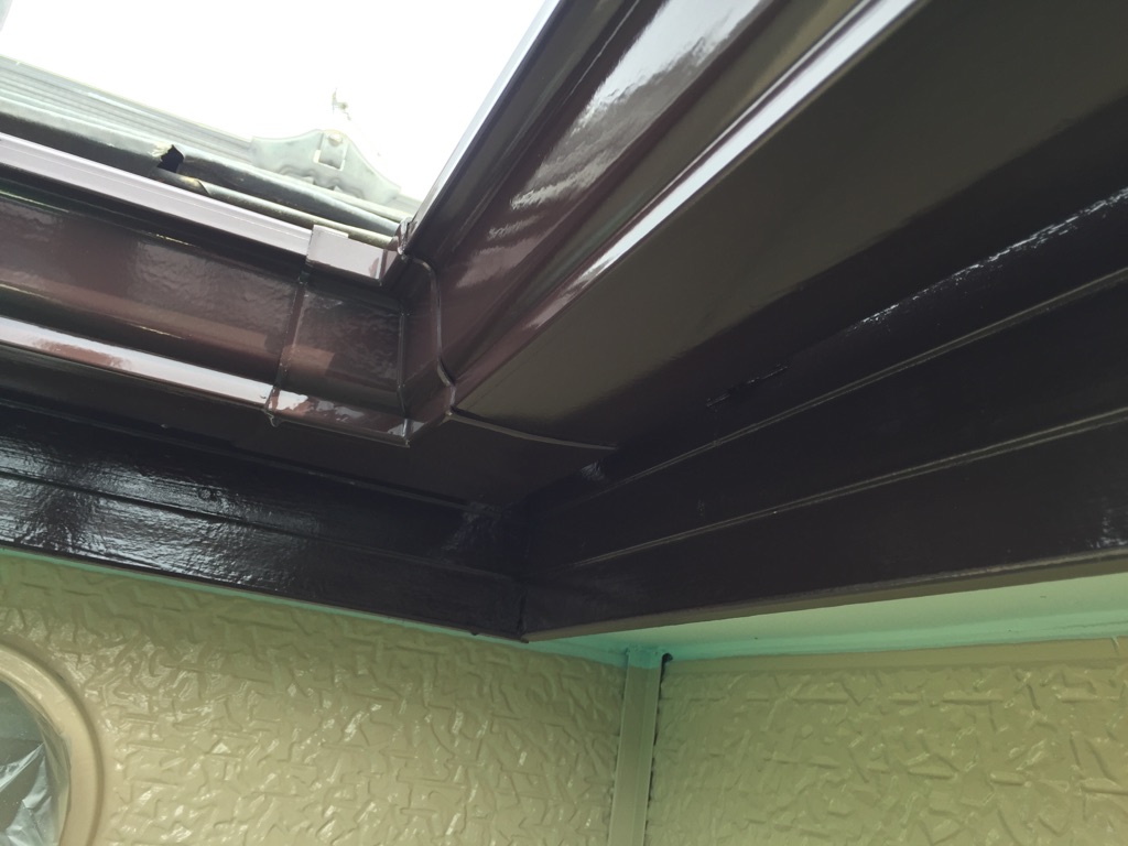 養生を外しながら、破風板、雨樋及びトタン霧除けの塗装。マイルドシリコン ココナツブラウン色で施工。