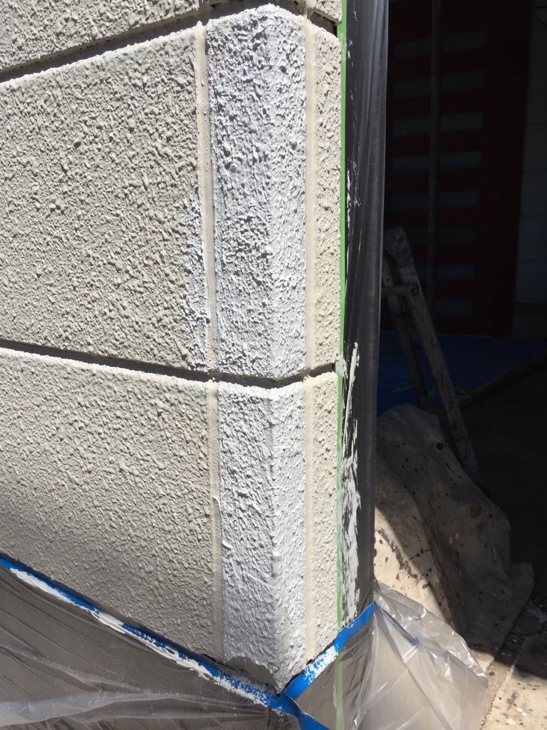 外構 塀の塗装。旧塗膜が剥がれている場所はパターンを付けてから、フィーラー及び中塗り、上塗り塗装。