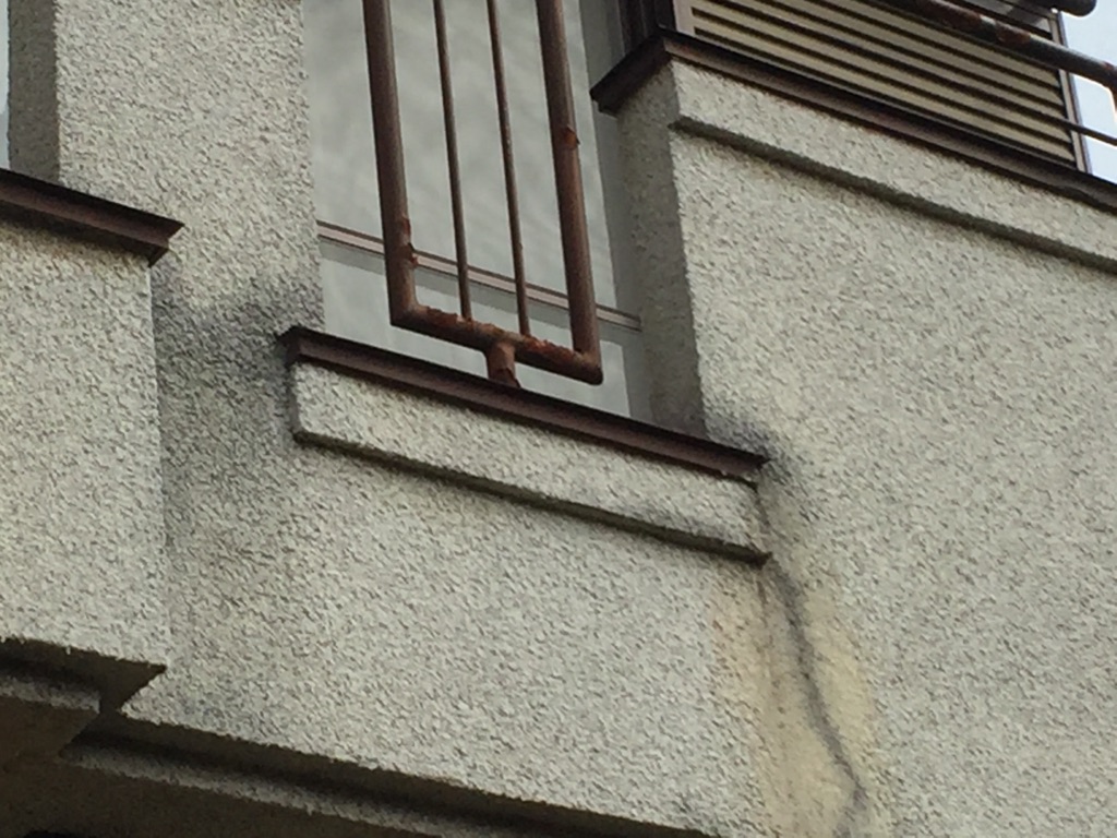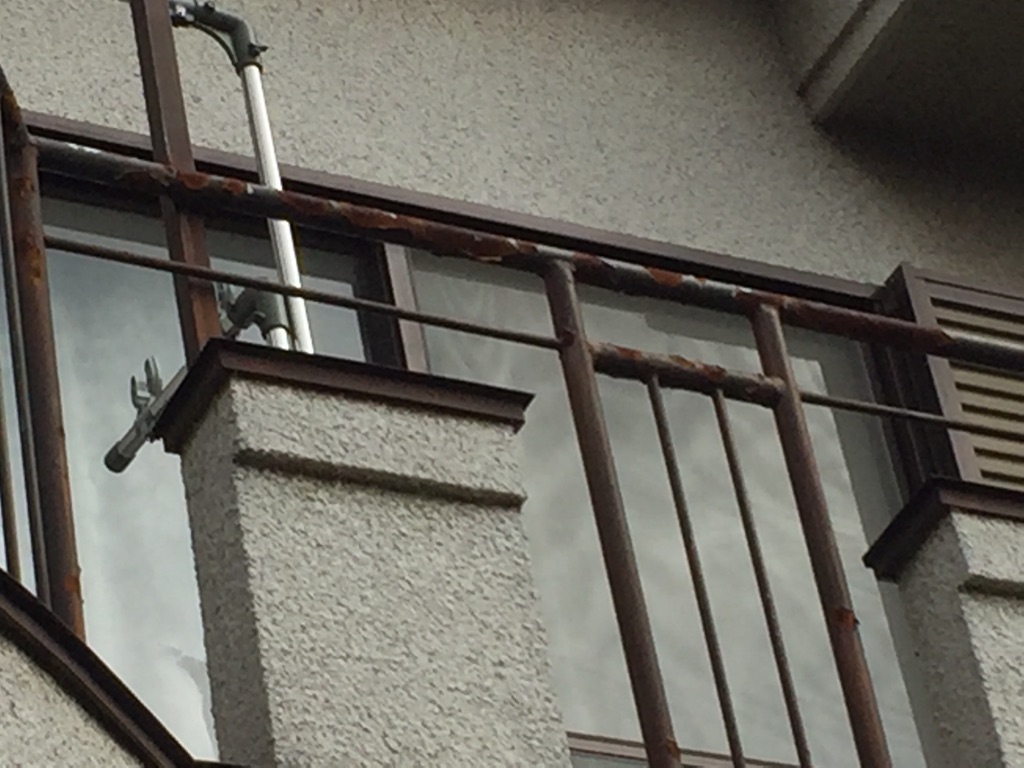 ベランダ防水部の膨れ。鉄骨の劣化による上塗り塗装及さび止め塗装の剥離。