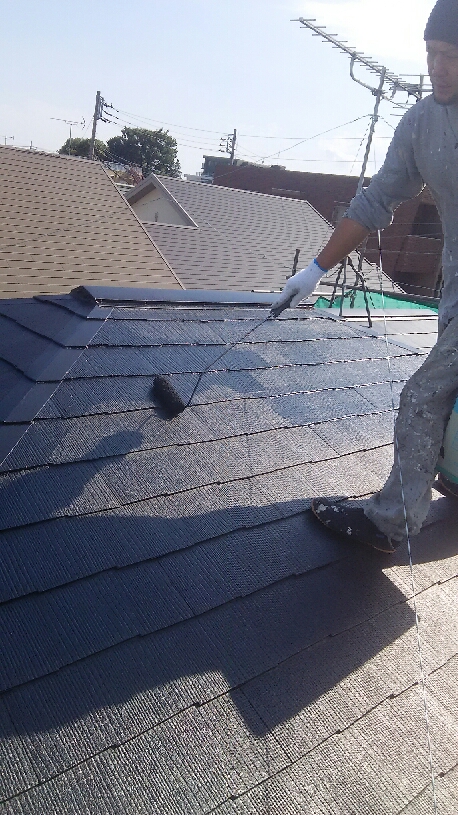コロニアル屋根 ヤネフレッシュ艶消し黒 中塗り、上塗り塗装。