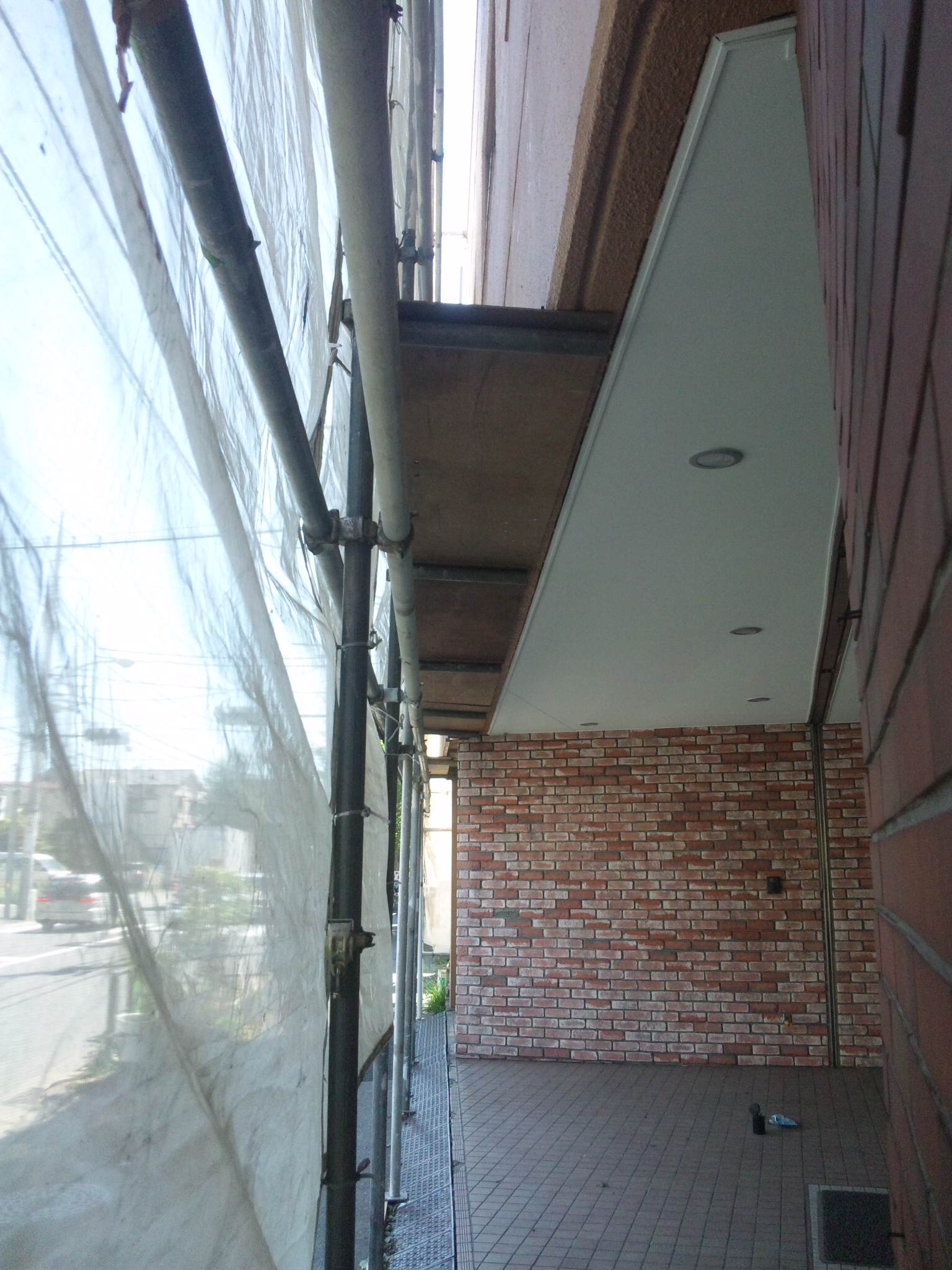 まず、足場の「朝顔」と呼ばれる落下防止装置 写真のべニア板の部分の取り付けです。物が万が一落ちてきても下にいる人が安全になるものです。