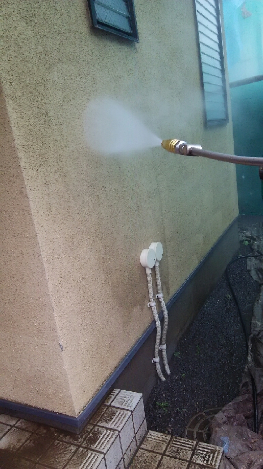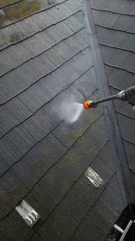 屋根及び外壁 高圧洗浄。その際、ご近隣様と隣接しているため、洗った水が飛び散らないように、注意しながらの作業をいたします。