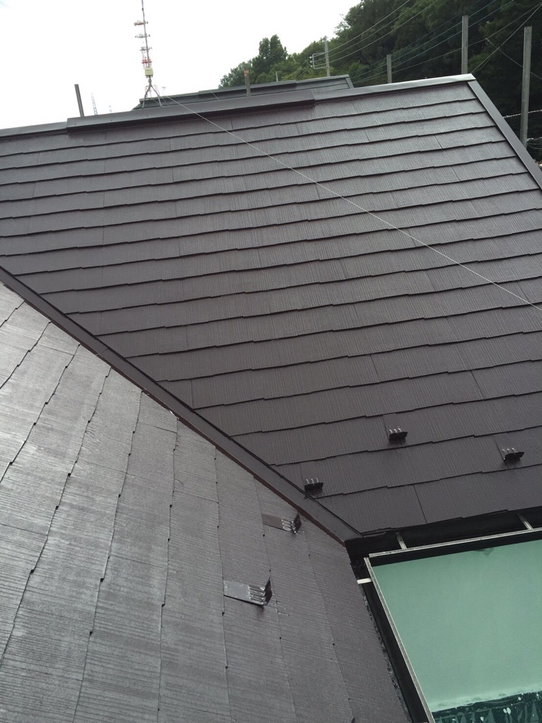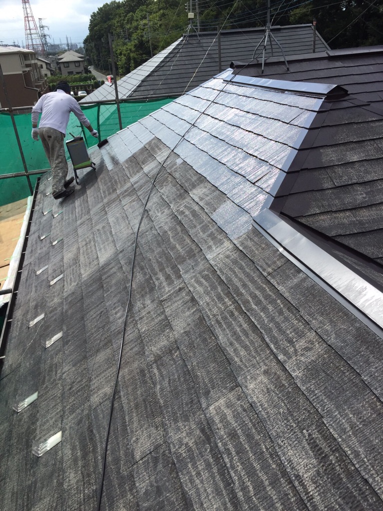 コロニアル屋根のプライマー塗装及び中塗り塗装。ヤネフレッシュ ココナツブラウン色 にて施工。