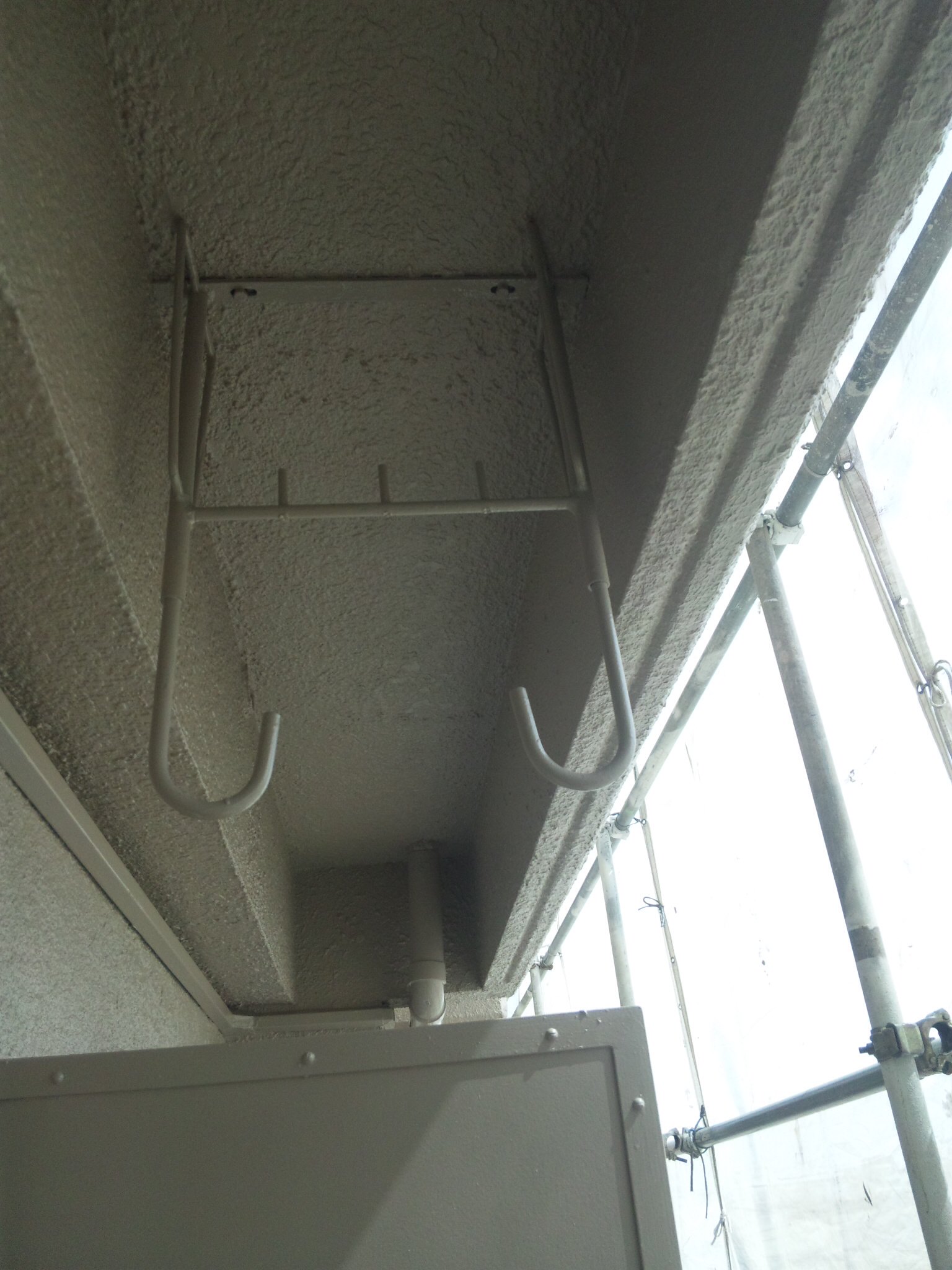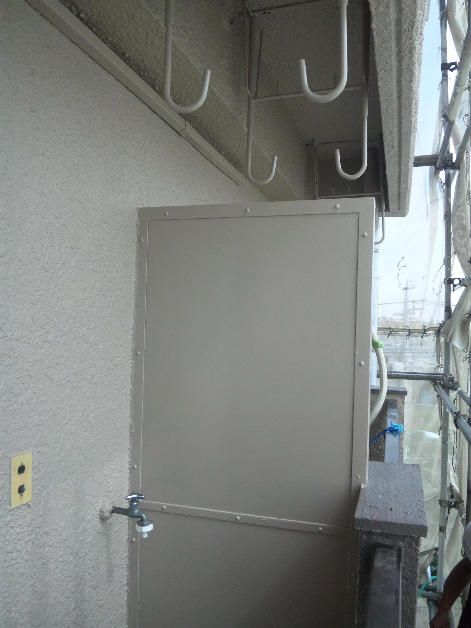 作業の方は前回東面の外壁が終了しておりますので、物干しフック、パネル、ドレーンパイプ、パーテーションの上塗りです。