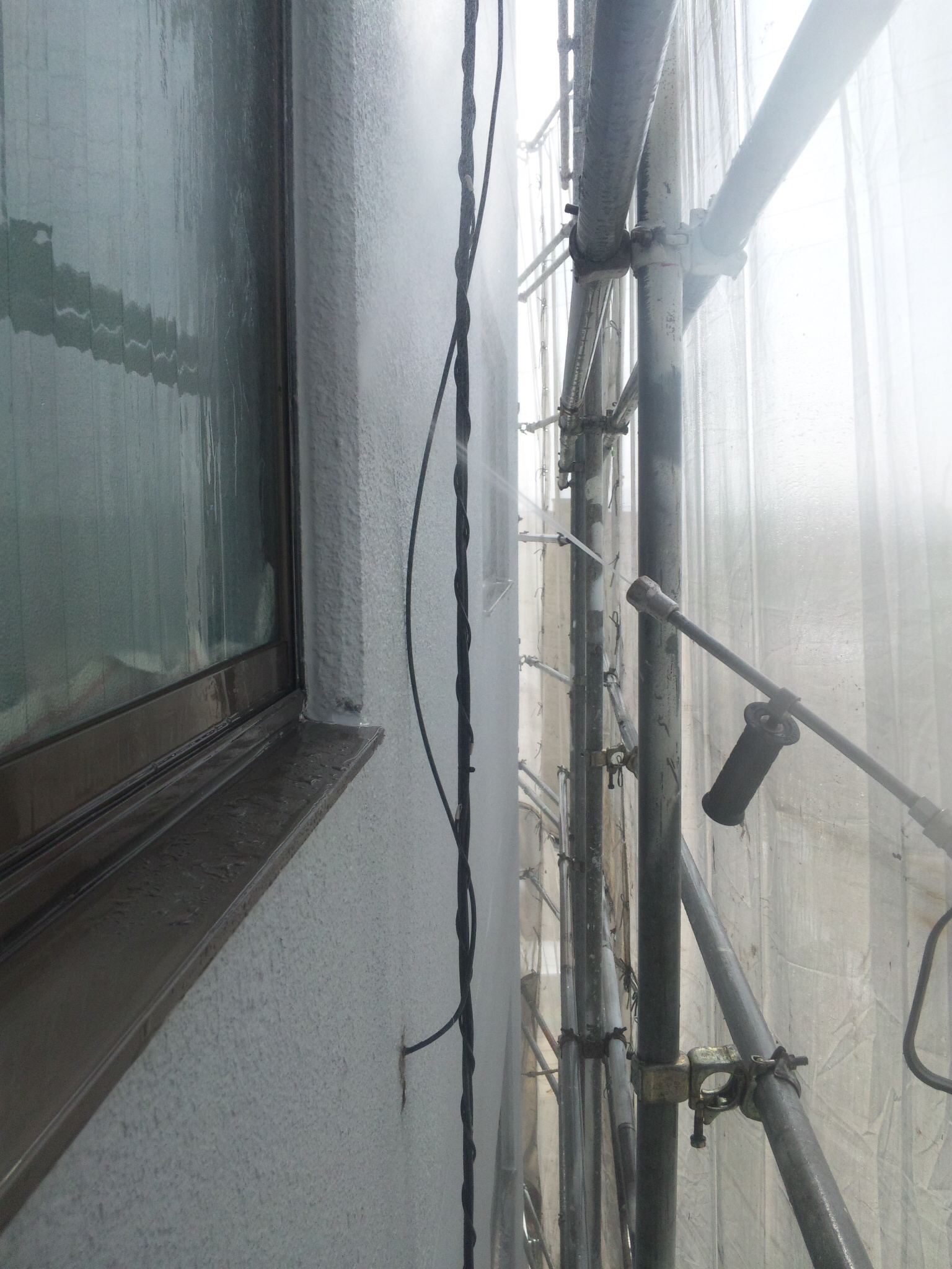 朝市で南面の高圧洗浄をいたしましたので、午後より養生をして明日以降の準備をしました。