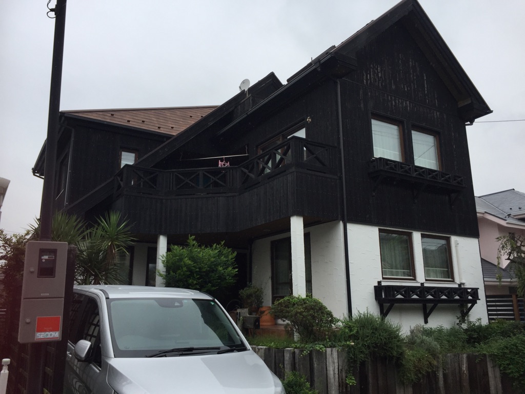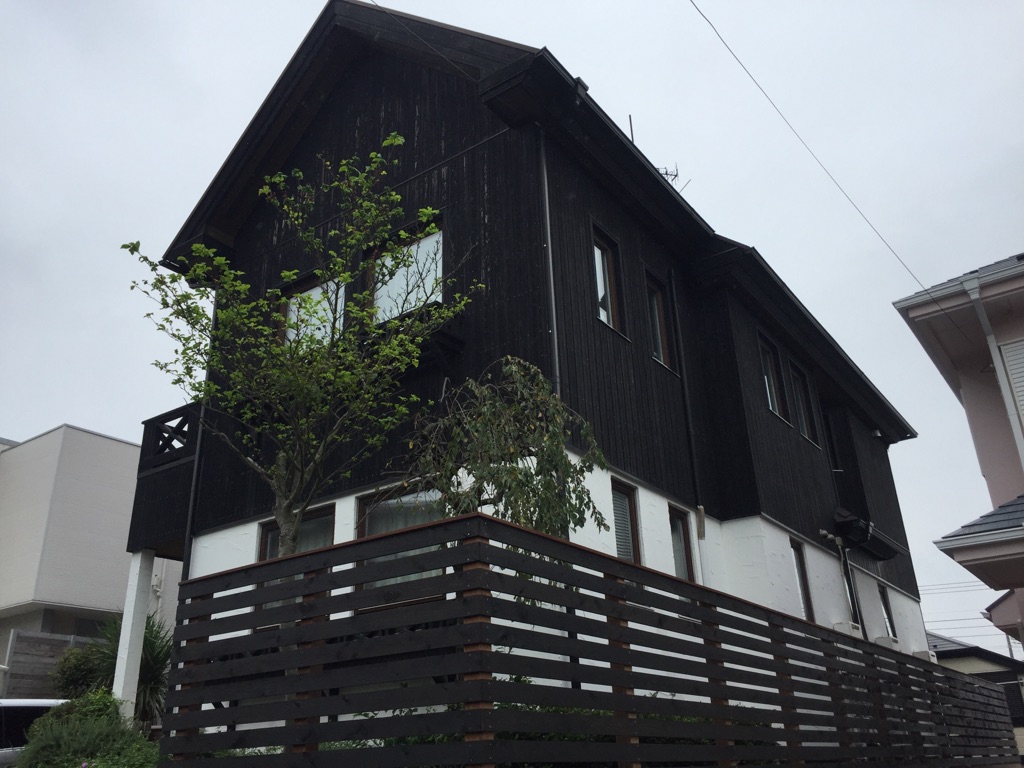 木製部分は キシラデコール塗装。色は黒色。 窓枠等の色は パリサンダ 軒天色 ピニー