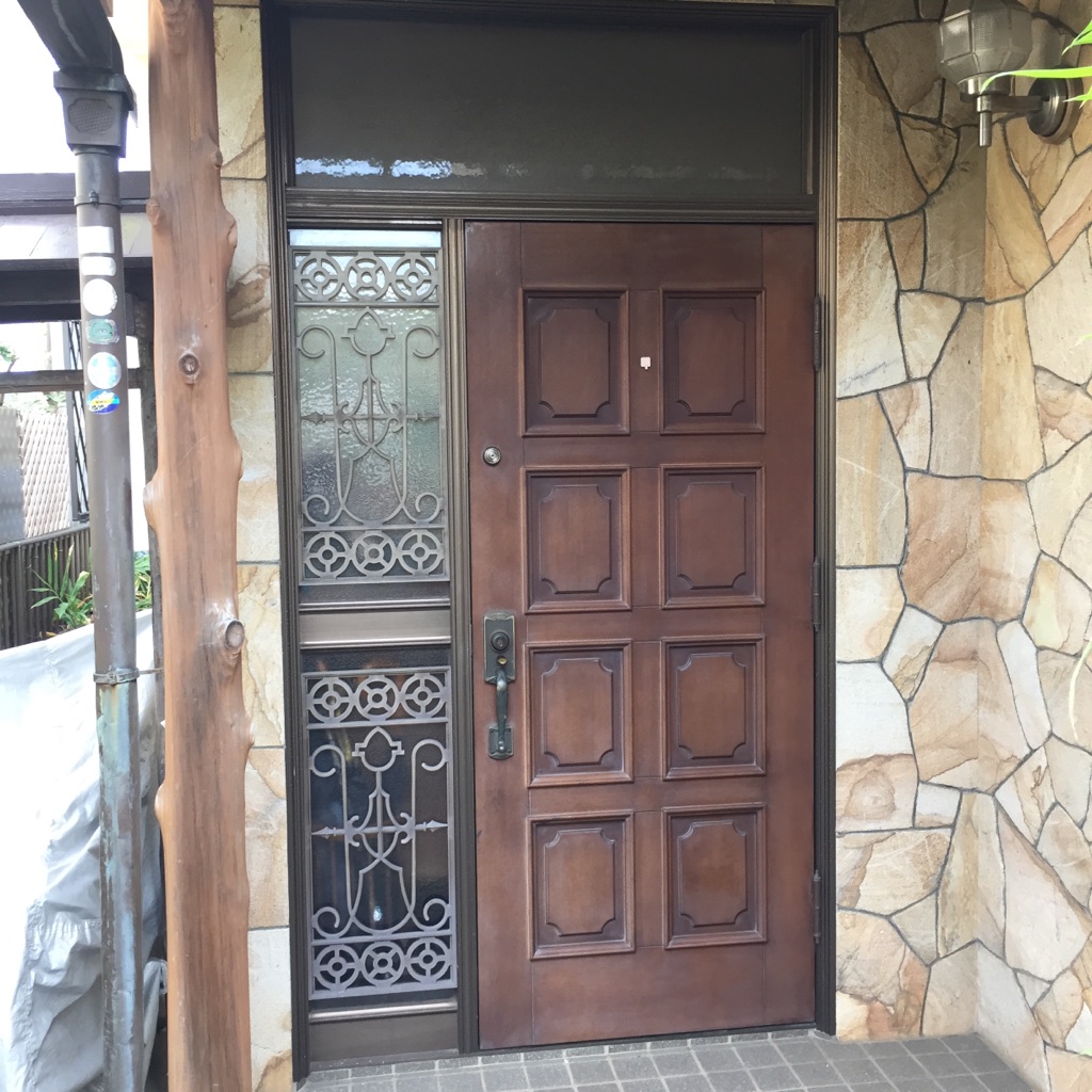 玄関ドアがワックスが残っている為、ワックス除去剤にて剥離、後クリアー塗装。
