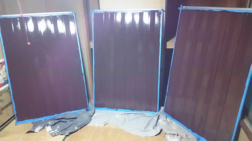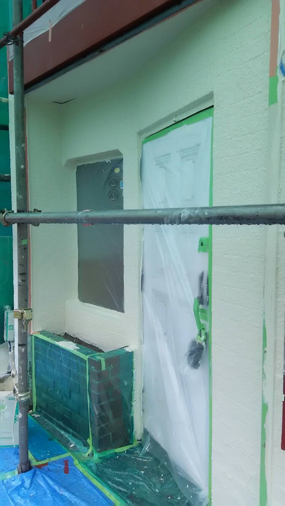養生を外しながら、木部鉄部の塗装。マイルドシリコン ココナツブラウン色にて施工。